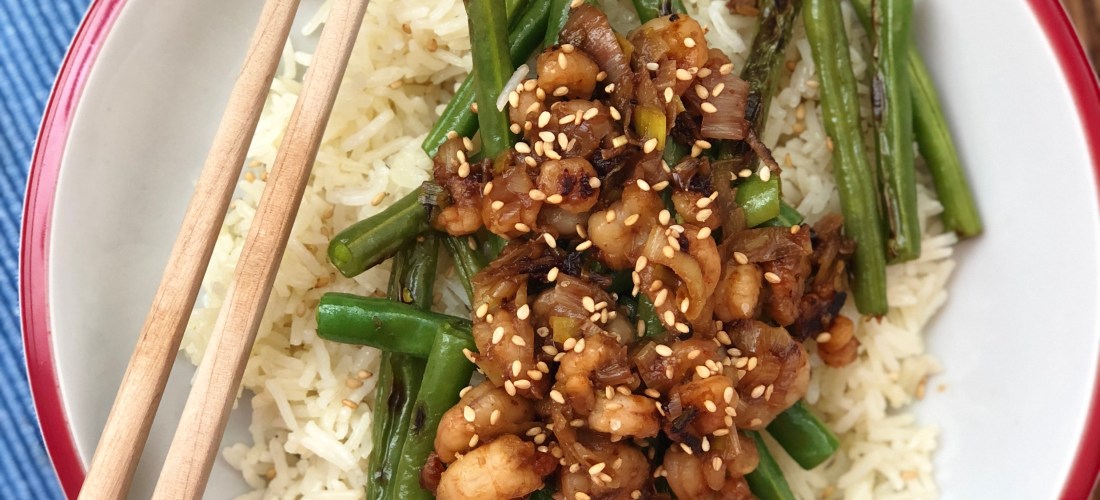 - Servir en una fuente el arroz, las judías por encima y el salteado de gambas y verter la salsa por encima.