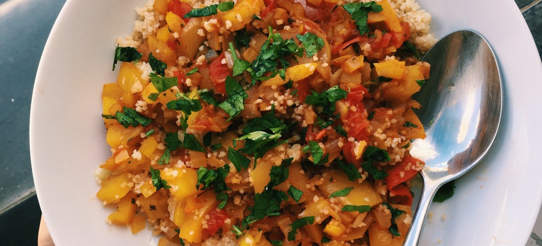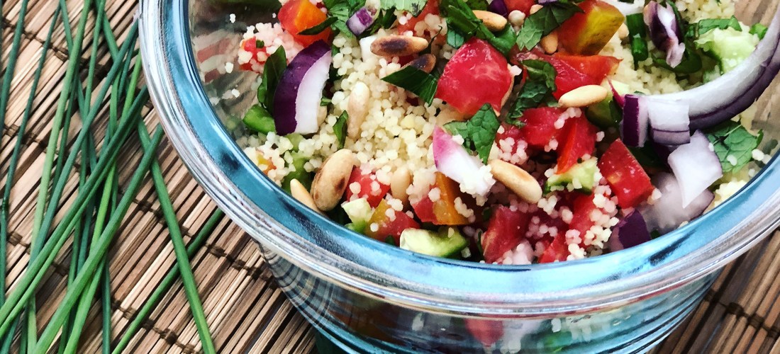 La elaboración de este plato es muy sencilla porque se trabaja en crudo y solo se tiene que cocer el cous cous y tostar los piñones. Para que os hagáis una idea, me he pasado más tiempo buscando ingredientes que cocinando. La historia tiene su gracia porque intentando buscar las 3 hierbas claves de este plato me he dado cuenta de que no quedaba cilantro en ninguno de los 5 supers analizados. Entonces he llegado a la conclusión de que quizás los lunes las existencias de cilantro están agotadas para todo el mundo ya que todos me han contestado lo mismo “el cilantro llega mañana”. Así que como no iba a renunciar a la cocina del día he decidido buscar un sustituto* y he utilizado cebollino. Ya sé que son diferentes pero ha sido un cambio que al probar el plato ha encajado perfecto. Así que ya sabéis, si compráis los ingredientes un lunes no busquéis cilantro comprad cebollino! 😉