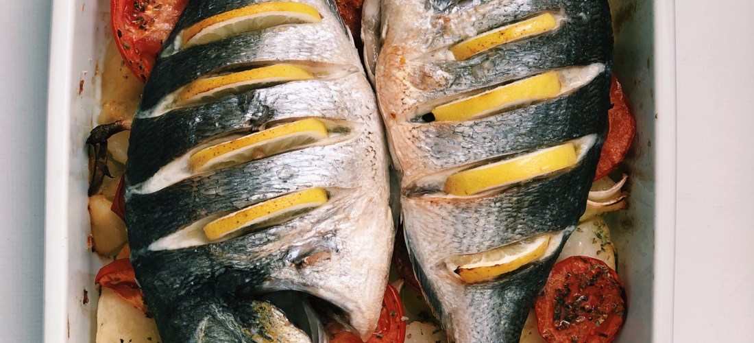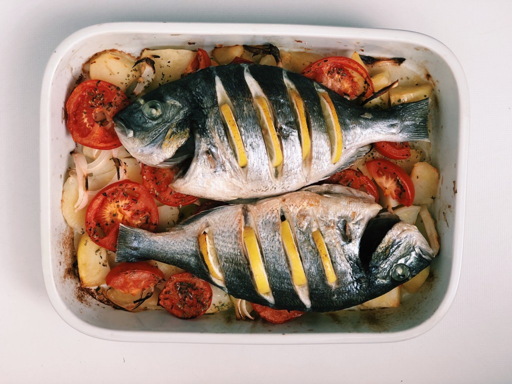 - Añadir las doradas por encima de las verduras junto con el zumo de 2 limones, una pizca de sal, pimienta y orégano.